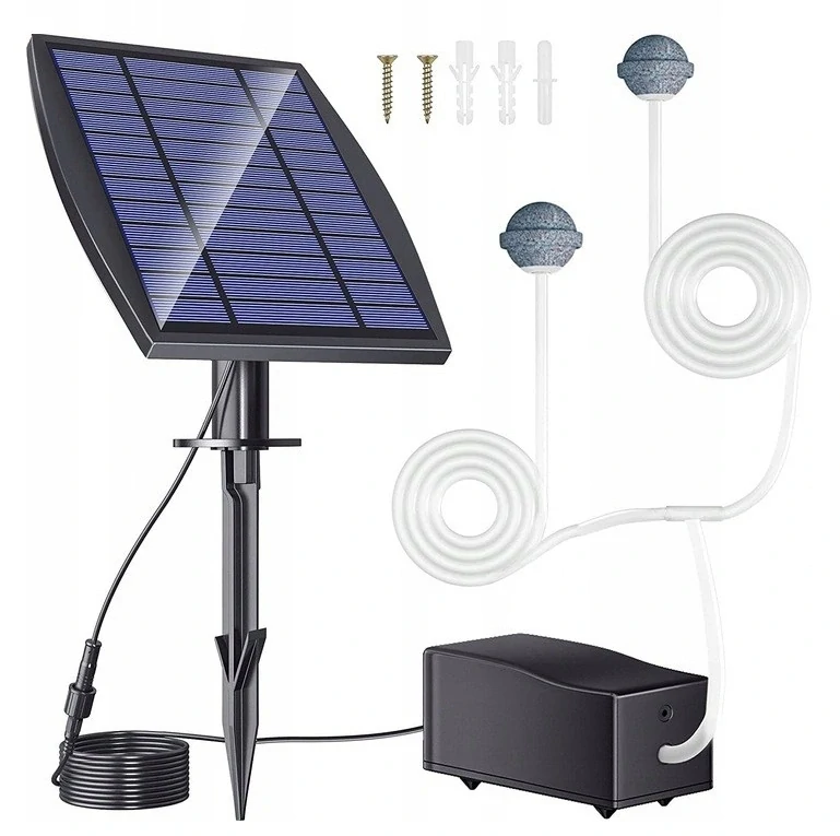 Solární kompresor s akumulátorem byl navržen pro rybníčky a jezírka na venkovní použití. Solární modul napájí kompresor, ten vhání vzduch přes hadici do vzduchového kamene. Výkon kompresoru závisí na ročním období a na umístění solárního modulu.