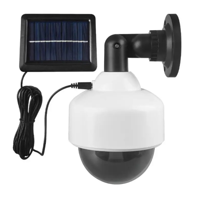 Solární atrapa bezpečnostní kamery s integrovaným detektorem pohybu, soumrakovým spínačem a solárním modulem. Dosah světla 5 metrů. Lze nastavit do polohy Vypnuto / Stálé svícení při setmění / PIR čidlo (svítí při zaznamenání pohybu dle nastavení). Světlo i solární panel lze díky držáku lehce nastavit do požadované polohy. K propojení světla se solárním panelem lze využít 3 metry dlouhý propojovací kabel USB kabel.