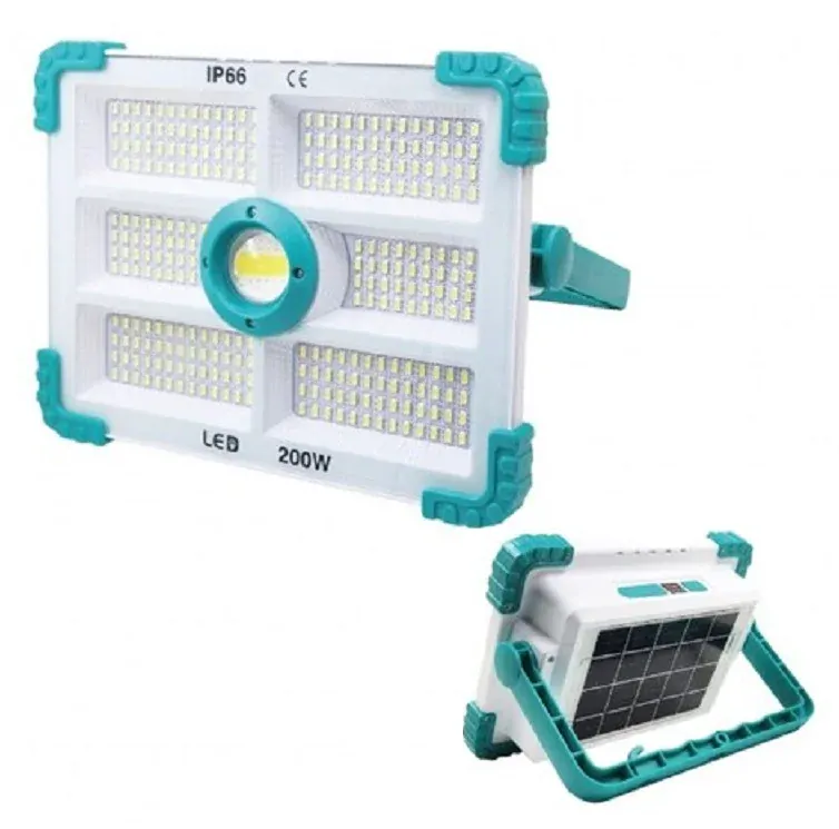 Přenosné solární světlo s praktickým stojánkem pro přenos nebo nastavení do pracovní pozice. Dosah světla cca 7 metrů. Světlo lze ovládat on/off vypínačem, opakovaným stiskem lze nastavit svícení čistých bílých diod v několika variantách (100% 70% 50% 30%), nebo výstražné SOS svícení červených a modrých diod. Pracovní doba na plné nabití cca 4-12 hodin dle zvoleného režimu svícení. Světlo lze nabíjet též USB, USB C kabelem pomocí běžné nabíječky mobilních telefonů a lze jím též mobilní telefon nabít.