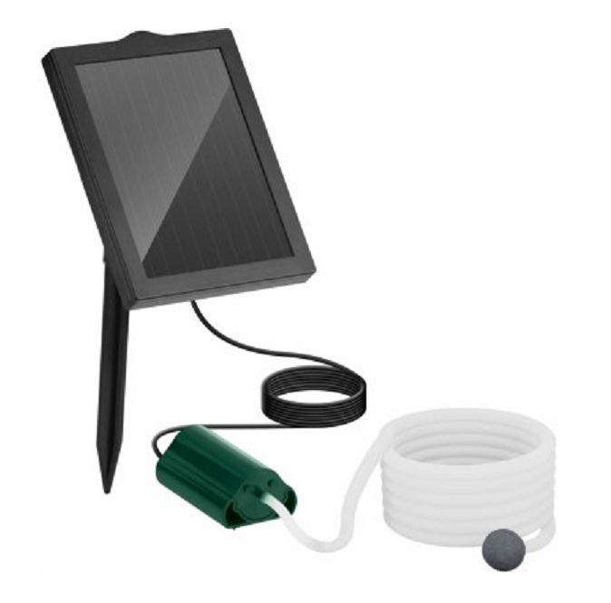 Ideální pro rybníky osazené rybami, kde především v letních měsících a vyšších teplotách dochází k poklesu obsahu kyslíku. Čerpadlo je umístěno mimo nádrž a je napájeno solárním článkem nezávisle na síťovém napájení. Přes 2m silikonovou hadici a aragonit se dá do rybníku dopravit kyslík. Solární modul má zapichovací hrot který upevňuje modul.