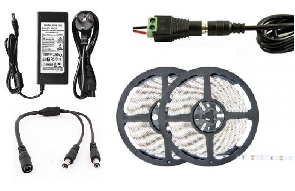 Set se skládá s 2 pětimetrových rolí LED pásku, dvou konektorů, napájecího zdroje a rozbočovacího kabelu.