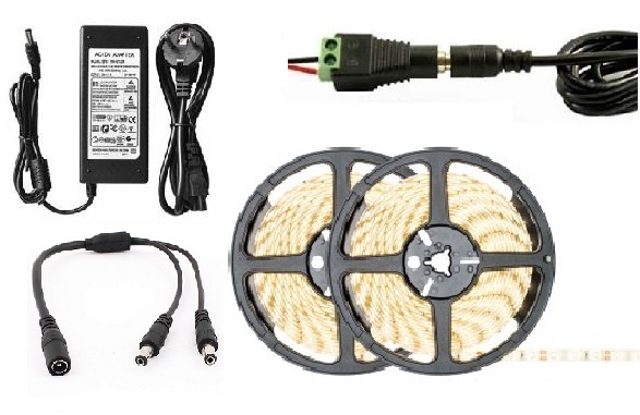 Set se skládá s 2 pětimetrových rolí LED pásku, dvou konektorů, napájecího zdroje a rozbočovacího kabelu.