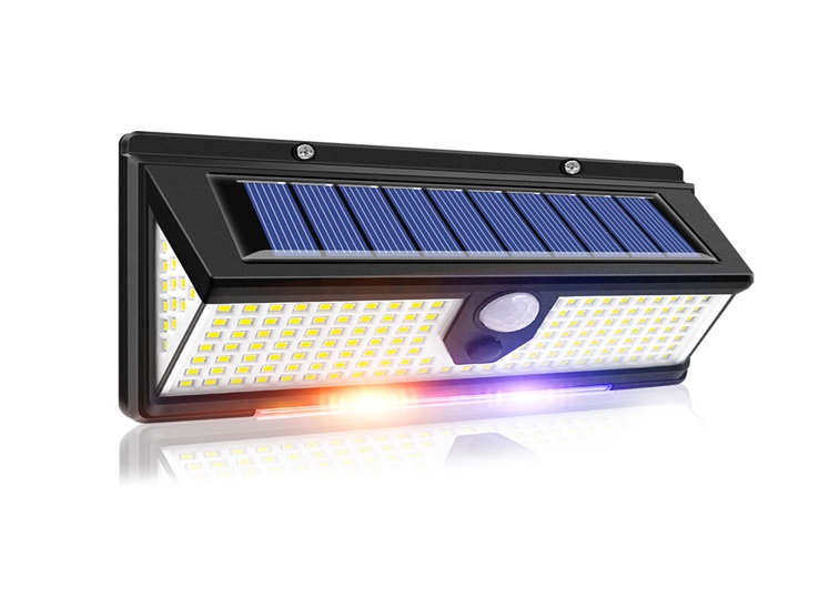 Solární LED světlo s detekcí pohybu a nouzovým režimem, světlo má 190 SMD diod z toho 172 bílých, 9 modrých a 9 červených, barevné diody jsou na spodní straně světla.