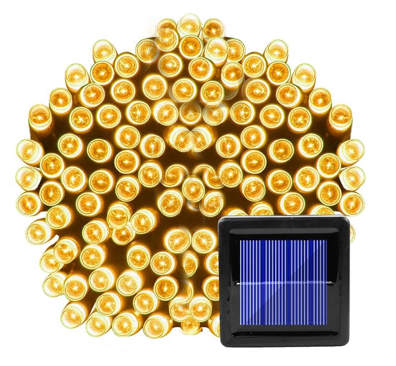 světelný řetěz se solárním panýlkem, napájený ze sluneční energie, přes den naakumuluje energii a po setmění se řetěz sám rozsvítí.