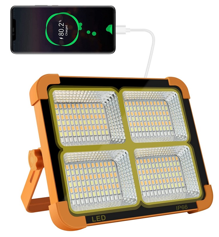 Přenosné solární světlo s praktickým stojánkem pro přenos nebo nastavení do pracovní pozice. Dosah světla cca 7 metrů. Světlo lze ovládat on/off vypínačem, opakovaným stiskem lze nastavit svícení čistých bílých diod, teplých bílých diod, svícení teplých i bílých diod současně a výstražné SOS svícení červených a modrých diod. Pracovní doba na plné nabití cca 4-12 hodin dle zvoleného režimu svícení. Světlo lze nabíjet též USB kabelem pomocí běžné nabíječky mobilních telefonů a lze jím též mobilní telefon nabít.